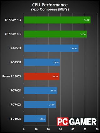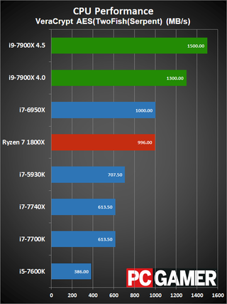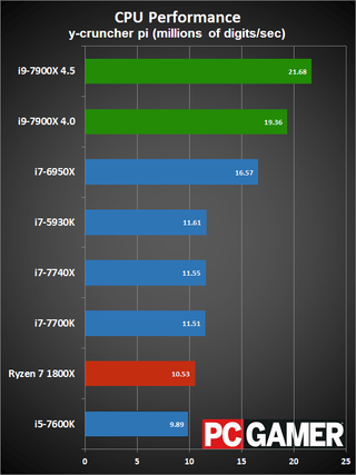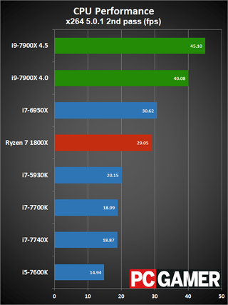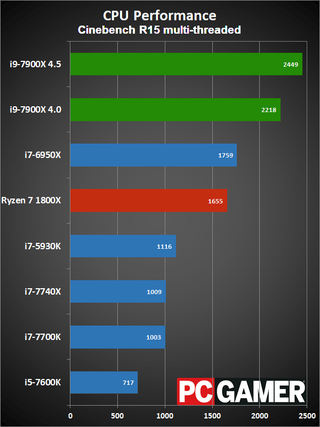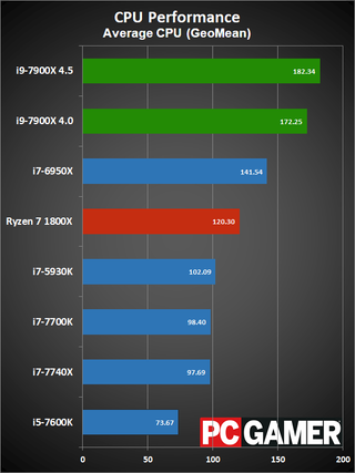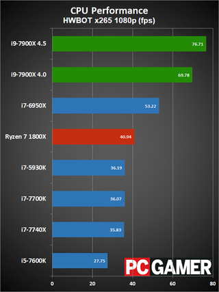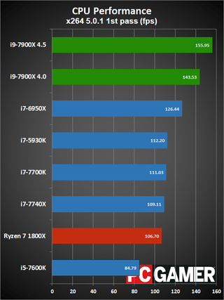 Okay, disclaimers about clockspeeds and Turbo Boost aside, here are the current results. The test hardware has been updated to use the GTX 1080 Ti FE, all systems were tested with 16GB of DDR4 memory (DDR4-2667 on the X99/X299 platforms, and DDR4-3200 on AM4 and LGA1151). I have two results for the i9-7900X, one with it running at a conservative 4.0GHz, and one at an aggressive 4.5GHz. The 4.0GHz clockspeed is what you should see at 'stock' for heavily threaded workloads, while the 4.5GHz results will better represent lighter workloads.