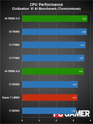 There are no surprises here. With a 10-core clockspeed of 4.0GHz as standard, plus architectural enhancements, the i9-7900X easily beats any and all current contenders. I'll be adding a few more CPUs to the charts over the next week (i7-6900K and i7-6850K for Intel, and Ryzen 7 1700, Ryzen 5 1600X, and Ryzen 5 1500X for AMD is my plan), but in CPU centric workloads Skylake-X proves compelling. If you do work that requires large amounts of multi-threaded processing, the upgrade in performance over the i7-6950X is substantial—not quite as large if you overclock both CPUs, but still. Single-threaded performance is also good, looking at Cinebench, at least if we take the 4.5GHz result as the expected outcome. The Civilization VI AI benchmark meanwhile shows that the game doesn't scale quite as well with multi-threaded CPUs as we might have hoped.