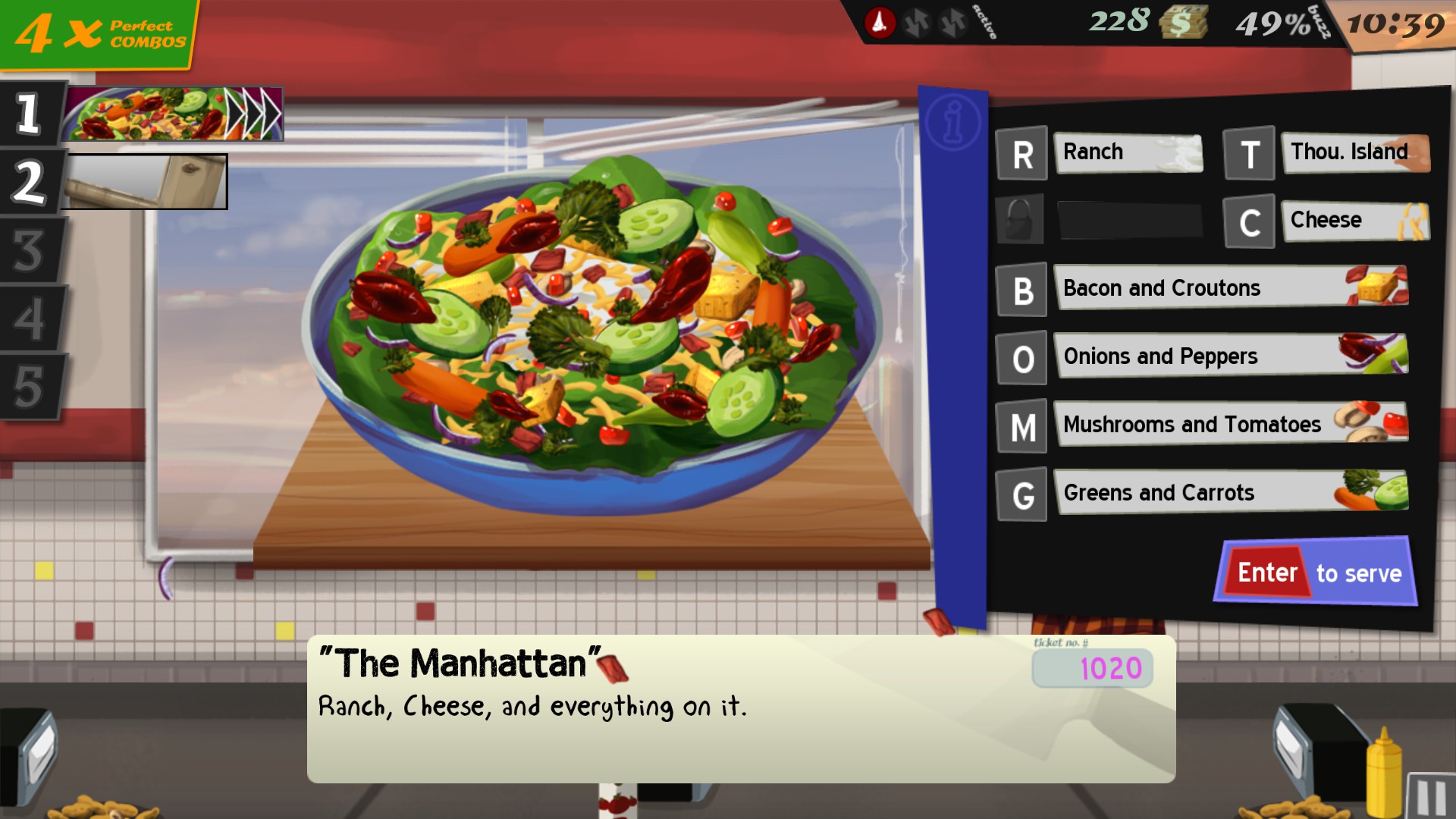 Cook, Serve, Delicious! is not an easy game. Part of the challenge is that the keys tied to ingredients are not always obvious. A baked potato, for instance, can be topped with bacon, onions, sour cream, and cheese by pressing B, O, S, and C. If a customer wants chives and butter? That's H and Y. And it's not consistent between dishes either. As well as being cheese on a potato C doubles for a scoop of chocolate in ice cream, while H is a cherry on top of it.
