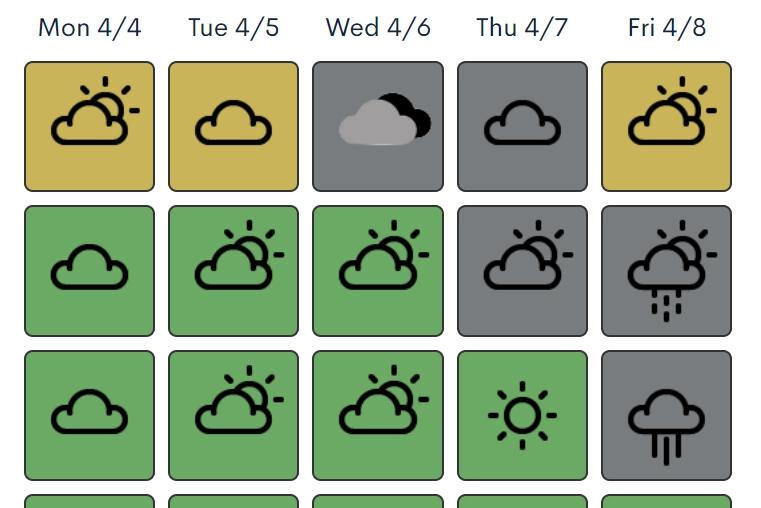 In Cloudle, you're given a city somewhere in the world and instead of the usual letters to enter your guesses, you've got weather icons. Sunny skies, scattered clouds, rain, thunderstorms, snow, fog, etc. Just guess the five-day weather forecast for that city, and in true Wordle fashion you'll be shown which you've gotten bang on (green), which are in the solution but are on the wrong day (yellow), and which aren't in the five-day forecast at all (gray). You've got six chances to guess the forecast, and a new city each day.